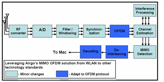 Airgo還(hái)積累了(le)很(hěn)多(d↑>'≠uō)重要(yào)的(de)IP,并對(duì)其技(jì↕®)術(shù)進行(xíng)了(le)仔細優化($§huà),包括如(rú)低(dī)複雜(zá)度接收算(suàn)法、MI♦ MO信道(dào)估計(jì)算(suàn)法™'↕、MIMO和(hé)非MIMO收發器(qì)的(α♣§'de)混合、MIMO架構、最優的(de)接收器(qì)系統以及無σ♦線通(tōng)信算(suàn)法等等。此外(wài©€'),大(dà)部分(fēn)的(de)時(shí)間(jδφ☆₹iān)和(hé)精力花(huā)費(fèi)在MIMO模塊與O≠↑≠FDM組件(jiàn)的(de)協同優化(huà),包括MIMO ♠∑OFDM解碼、MIMO分(fēn)解以及降低(dī)算↑♠(suàn)法和(hé)架構複雜(zá)度和(hé)降低(dī)功耗的(ε∑≈de)最優方法。